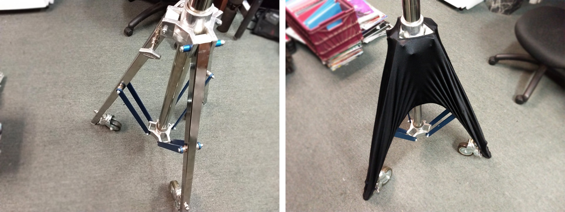 Shown here is a geared column light stand with our cover. We can cover single or all sides of any product. The bottom has pockets made from webbing that are used to cover over the posts.